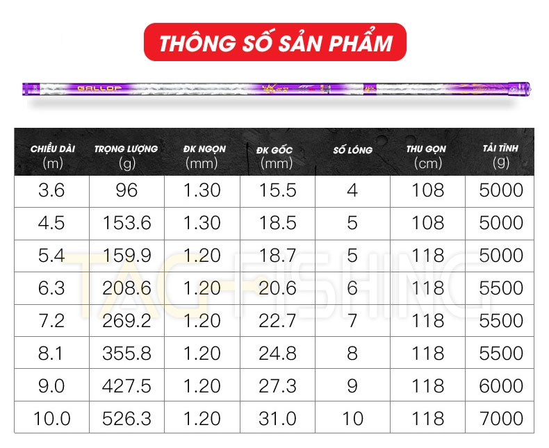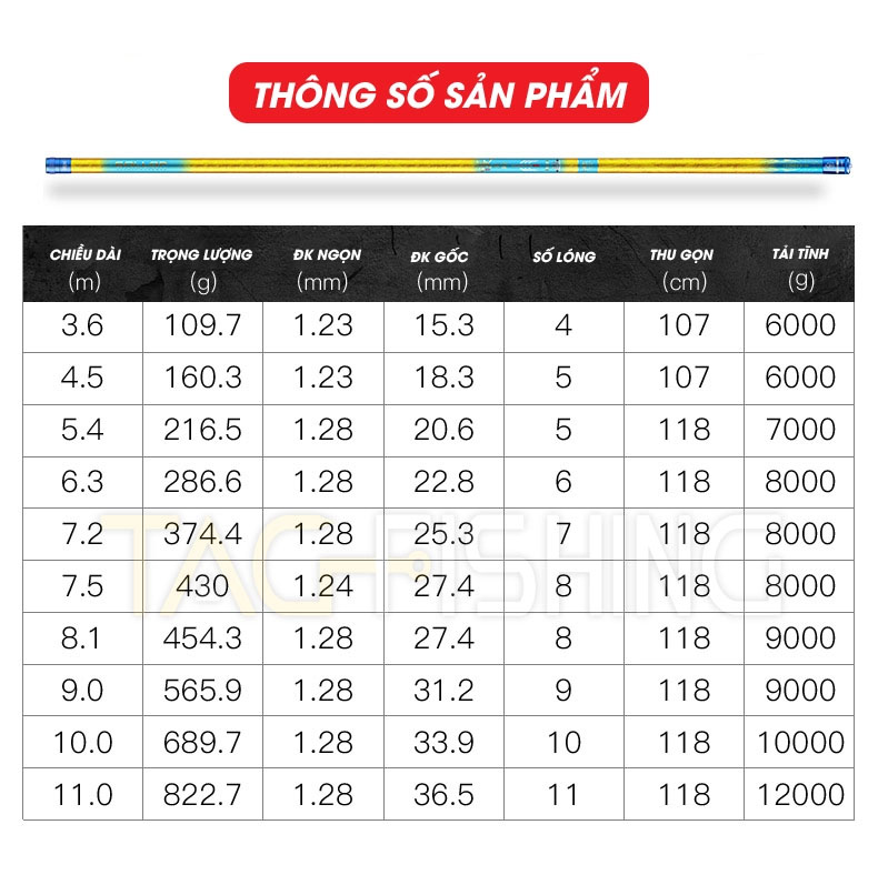 Dù là mới ra mắt nhưng cây cần này đã được anh em cần thủ truyền tai nhau về độ HOT, hứa hẹn sẽ làm mưa làm gió trên thị trường. Hiện tại bên Tag Fishing thì cây cần này có các size từ 3m6 đến 11m cho mọi người có sự lựa chọn. Theo như nhà sản xuất báo về thì cây cần này có tải tĩnh lên tới 12kg, lực phân bổ 19i. Mới đây em cũng đã làm video về test cây cần này tại hồ Văn Minh. Mọi người cùng xem để trải nghiệm nhé: